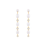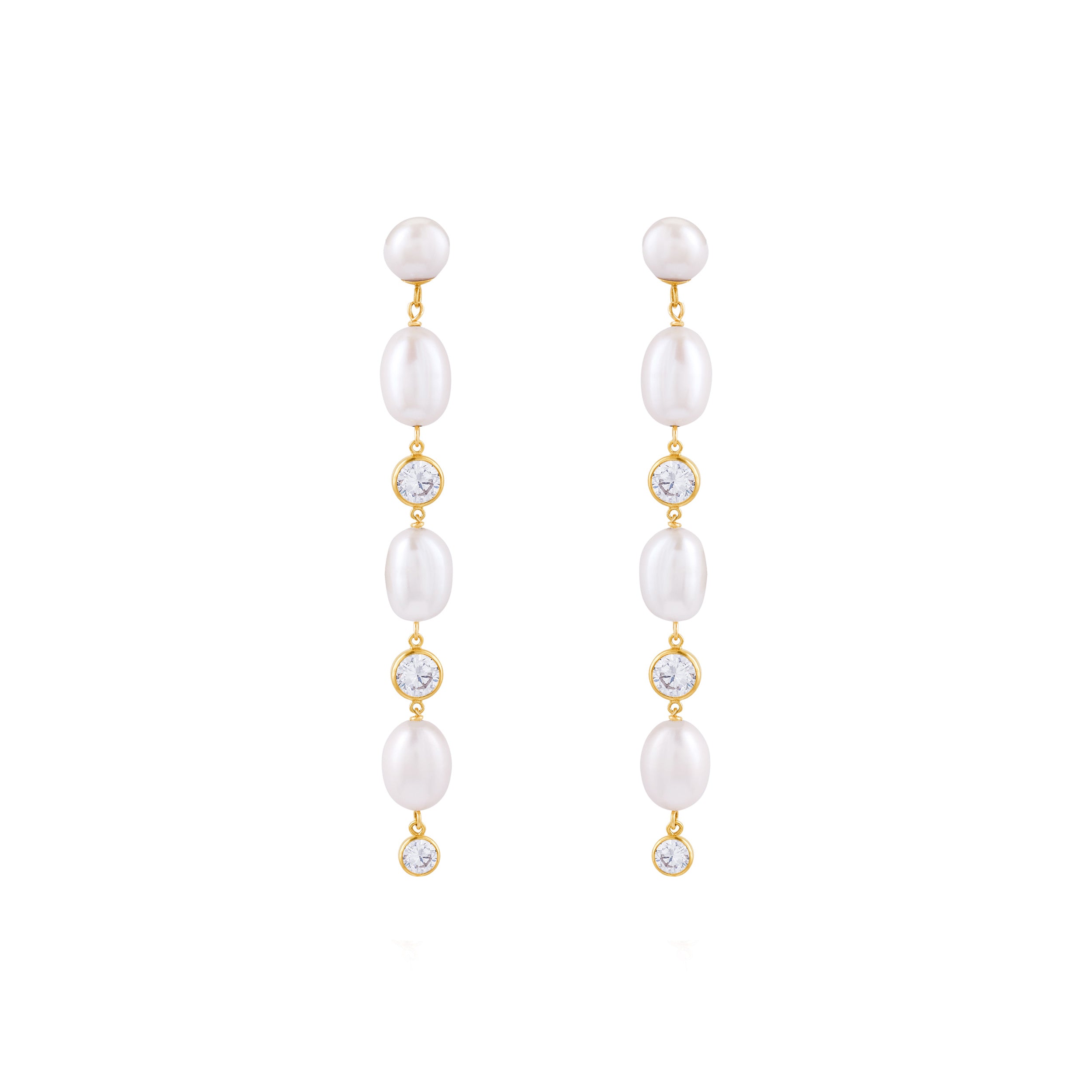 Elegant and modern freshwater pearl and zircon drop earrings, arranged in undulating sizes that cascade from your ears. Fresh and sparkling with day-to-night appeal.