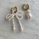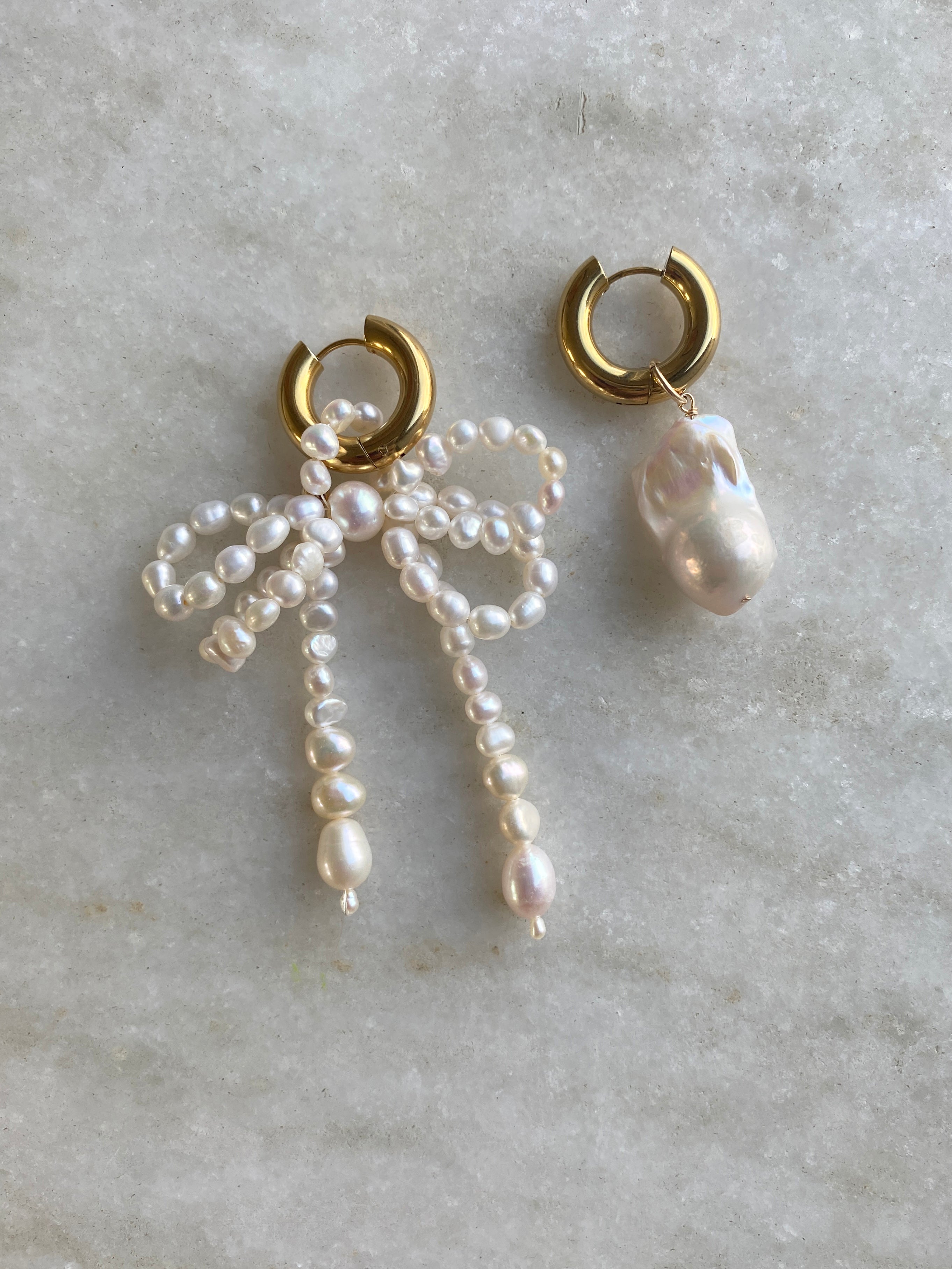 These mismatched earrings are handmade and hand-beaded into an irregular bow using ivory freshwater rice pearls & a single large baroque pearl.