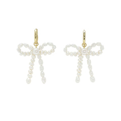 We have been designing and hand-making freshwater pearl bows since 2019; These ethereal earrings are hand-beaded using ivory freshwater pearls & are best when layered on your ear with our other bow earrings for maximum impact.