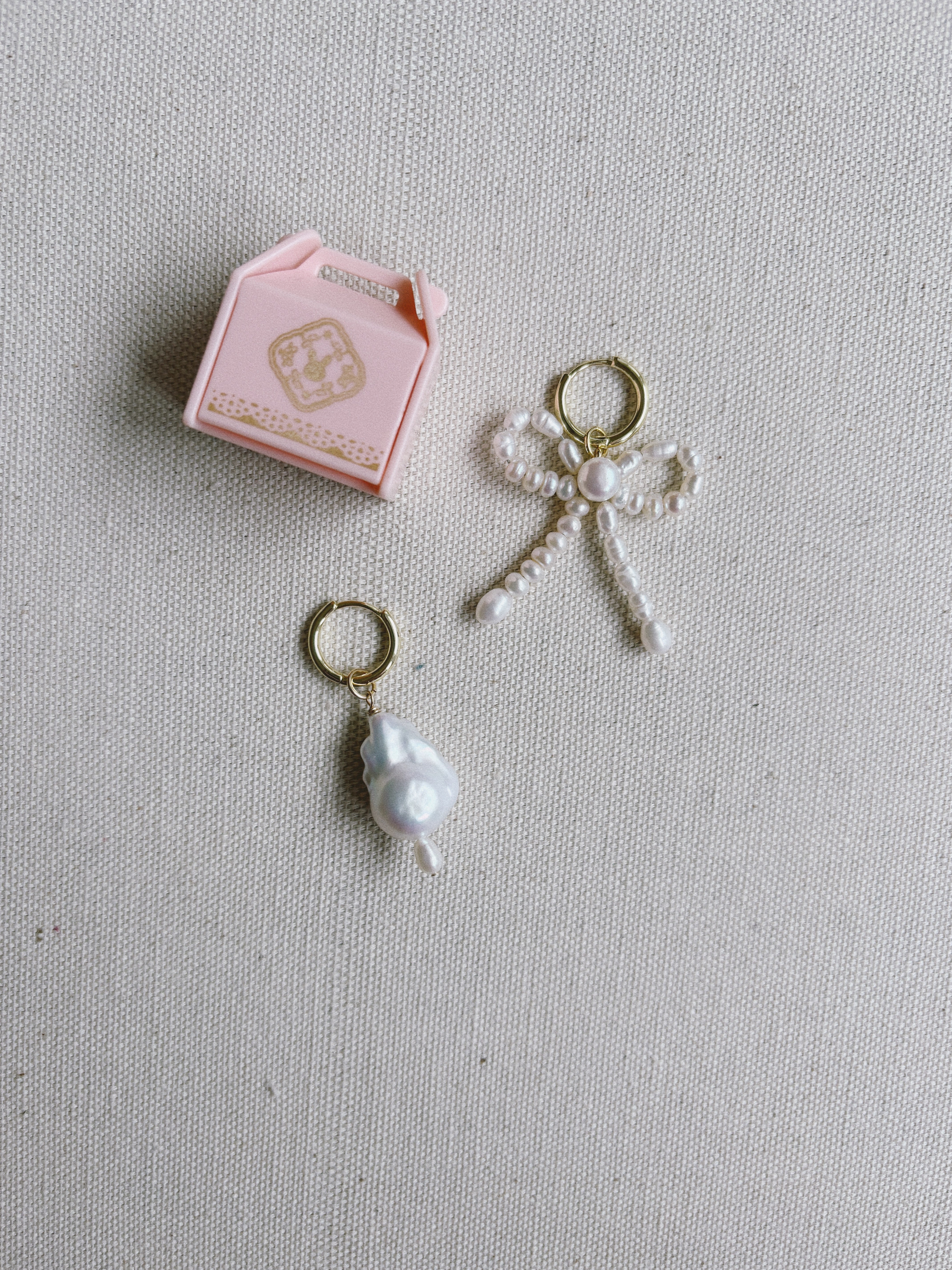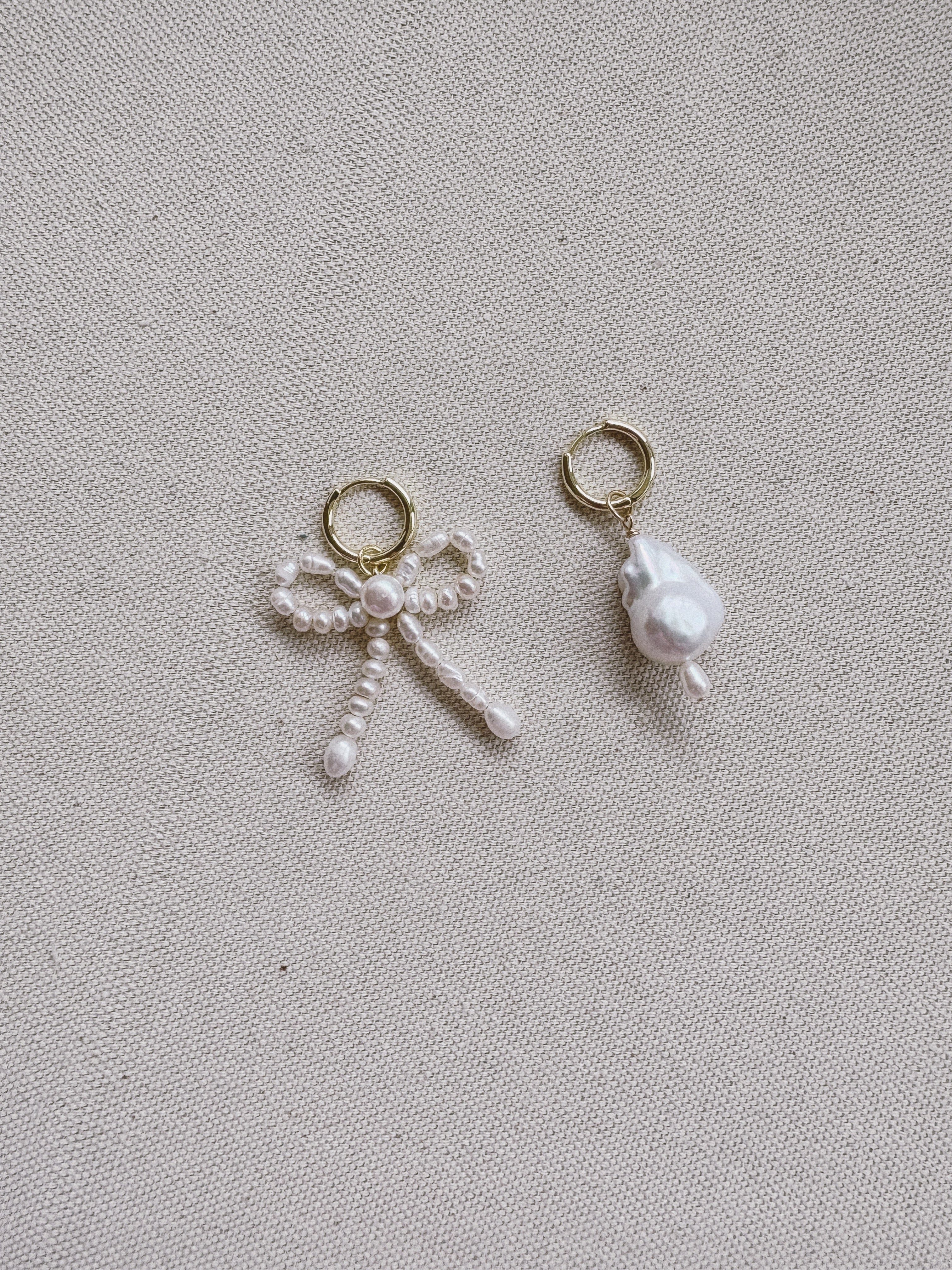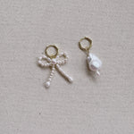 Ethereal mismatched hoop earrings are adorned with a petite hand-beaded bow using ivory freshwater pearls, and a contrasting small baroque pearl charm.