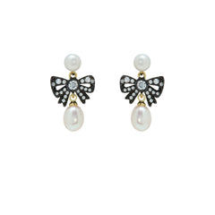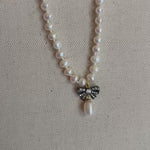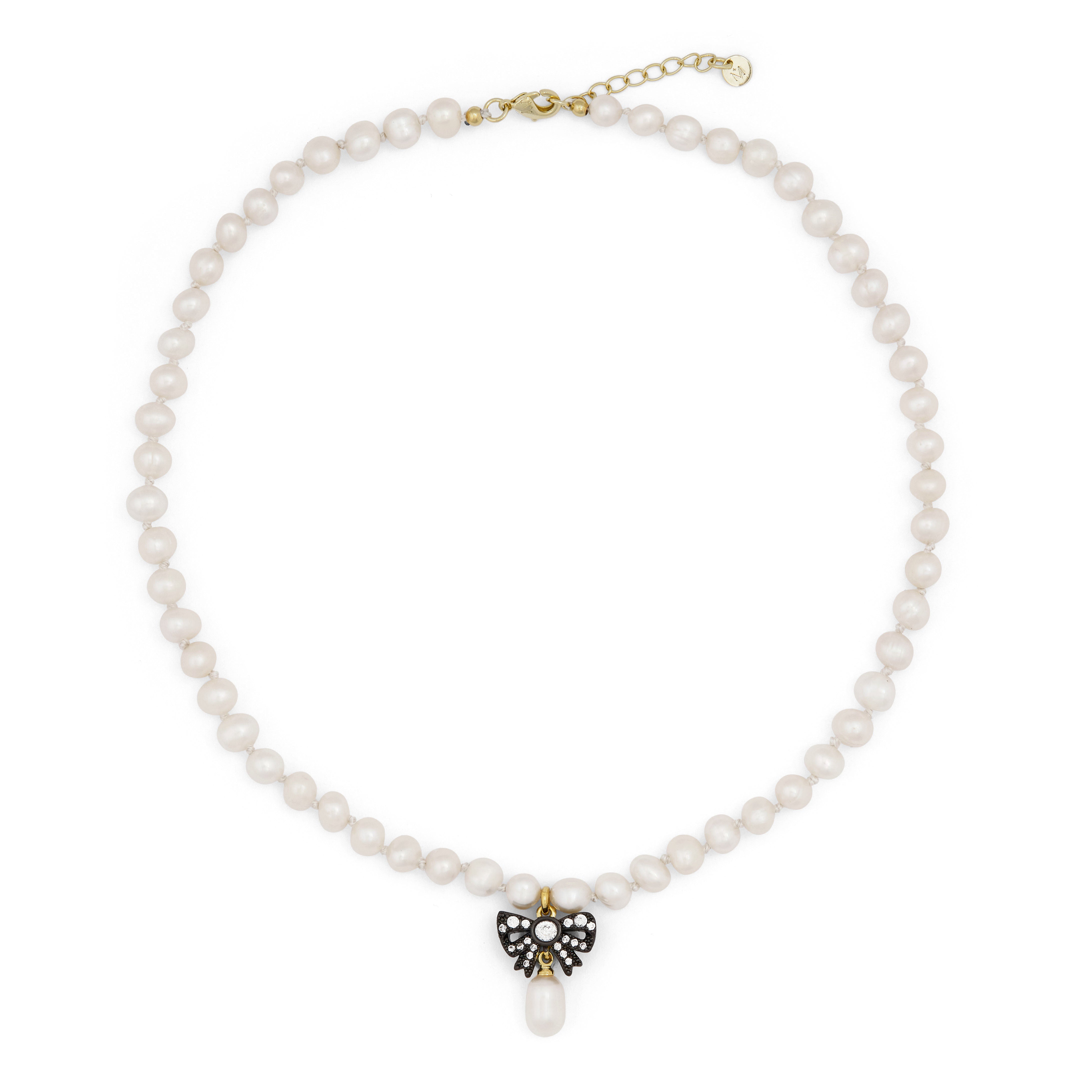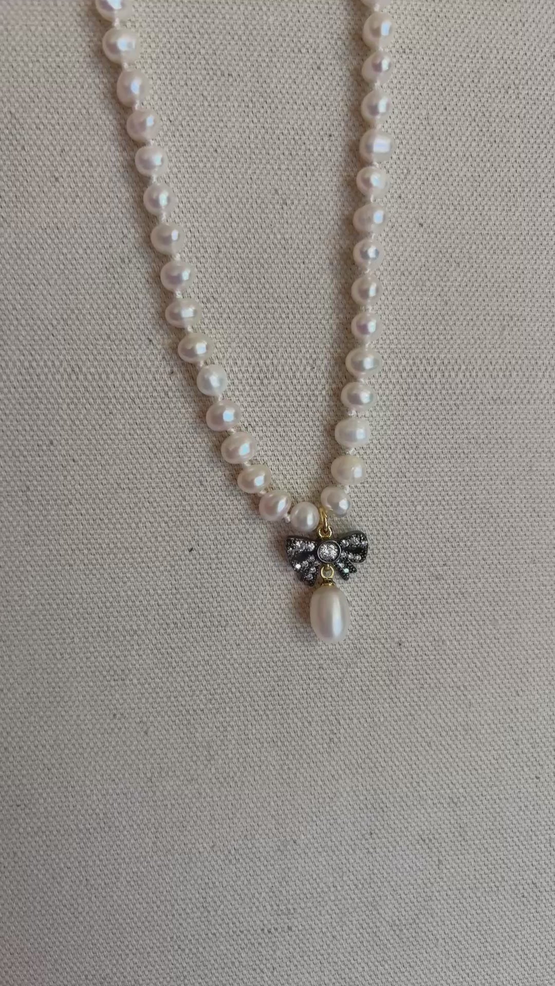 Designed especially for the Marie Antoinette exhibition at the V&A museum in London; This hand-knotted freshwater pearl necklace is finished with a bow pendant set with sparkling zircon stones.
