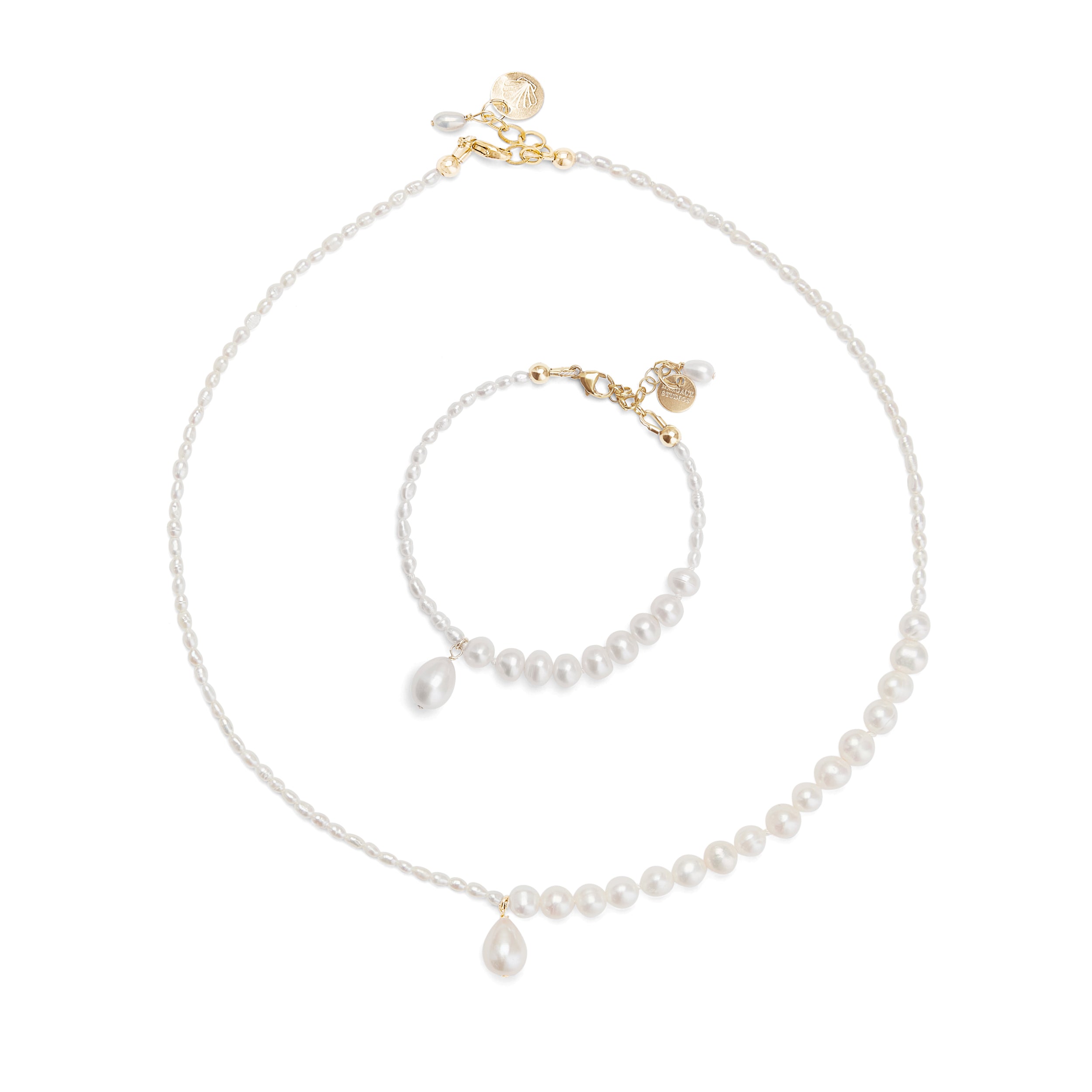 Subtle and refined, inspired by Swan Lake. Hand-knotted contrasting sizes of freshwater pearls have been finished with our signature teardrop pearl pendant. A delicate and elegant jewellery set you’ll wear forever.
