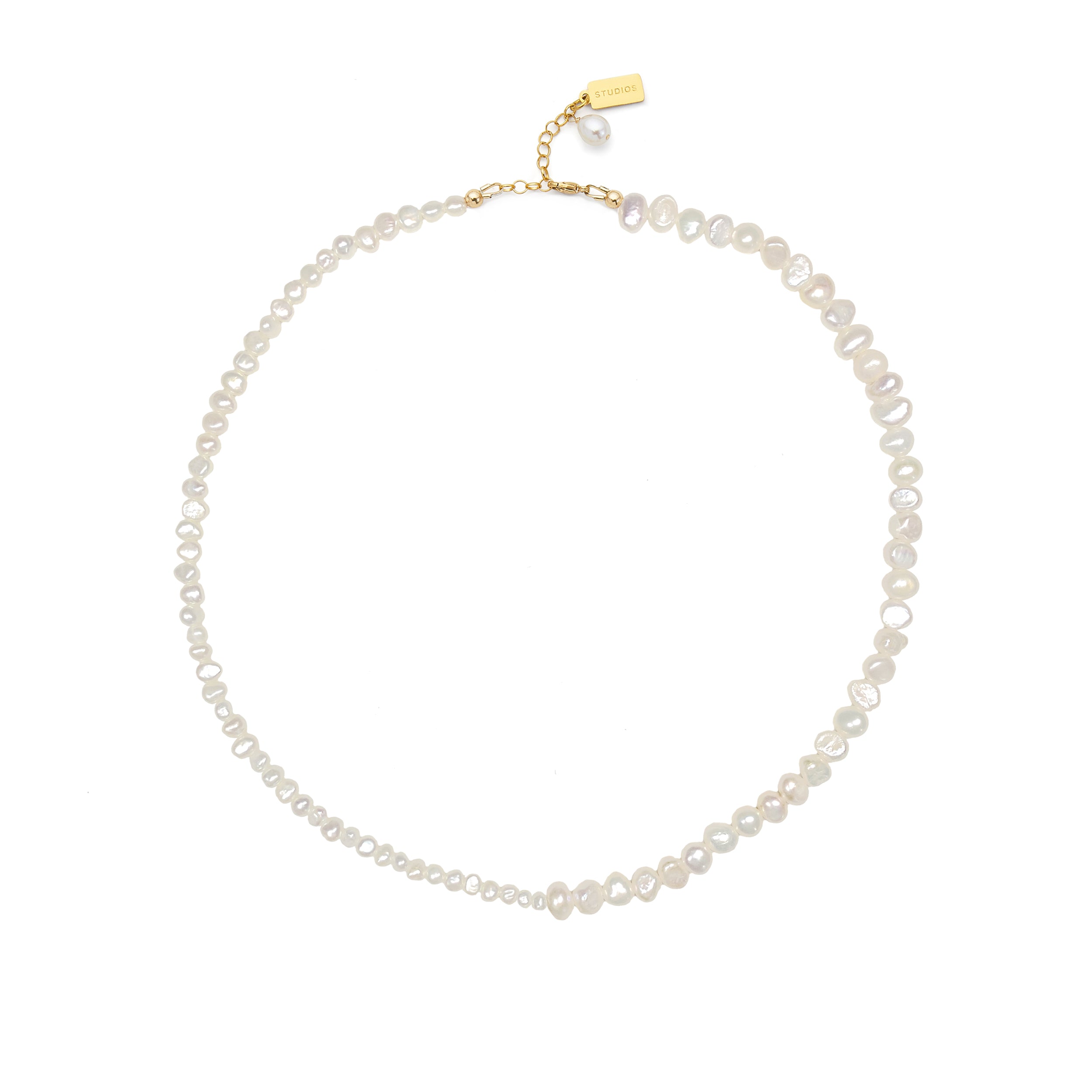A strand of delicate freshwater pearls in two contrasting sizes. A fresh take on a simple pearl necklace. Hand-knotted in ivory silk, extendable length.