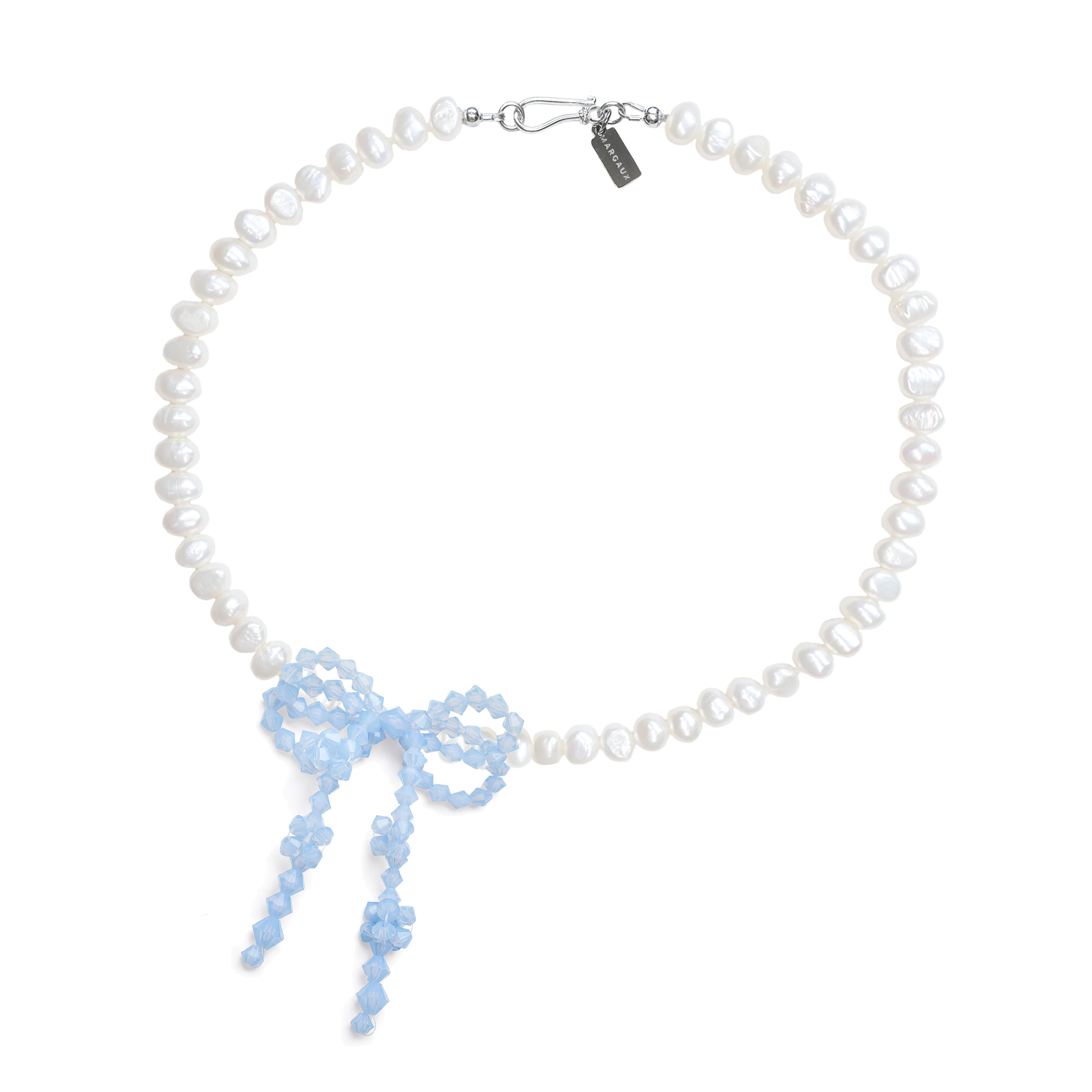 A strand of ethereal freshwater pearls with an off-centre handcrafted crystal, floral bow that sparkles around your neck.