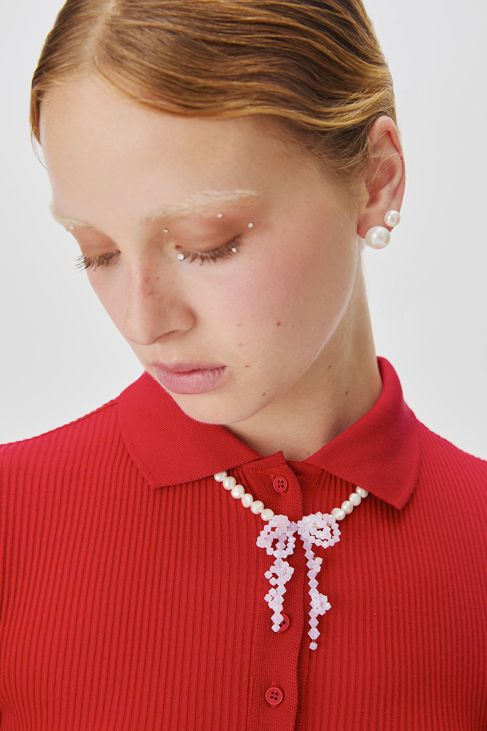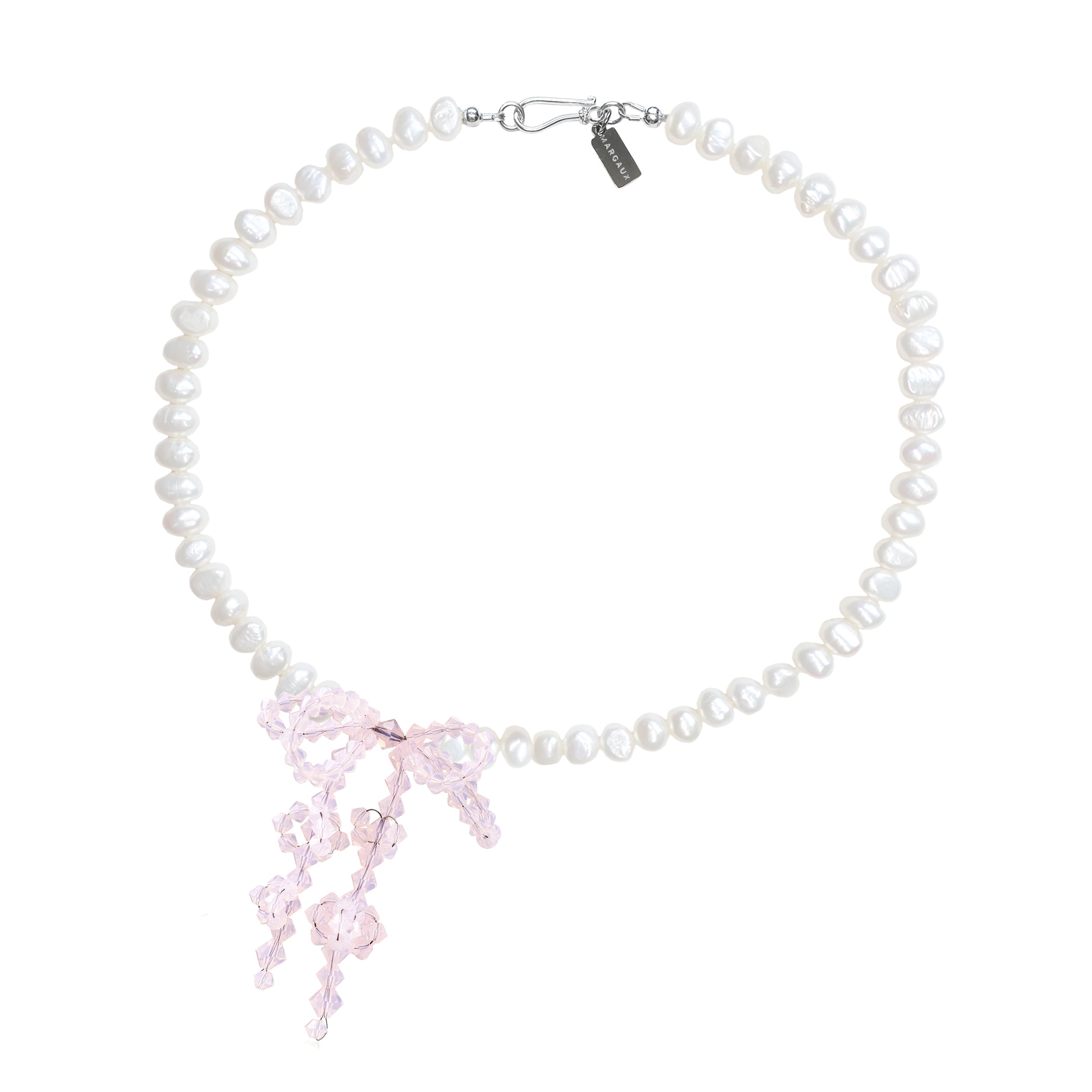 A strand of ethereal freshwater pearls with an off-centre handcrafted crystal, floral bow that sparkles around your neck. Add a subtle touch of romance and fun to your outfit.