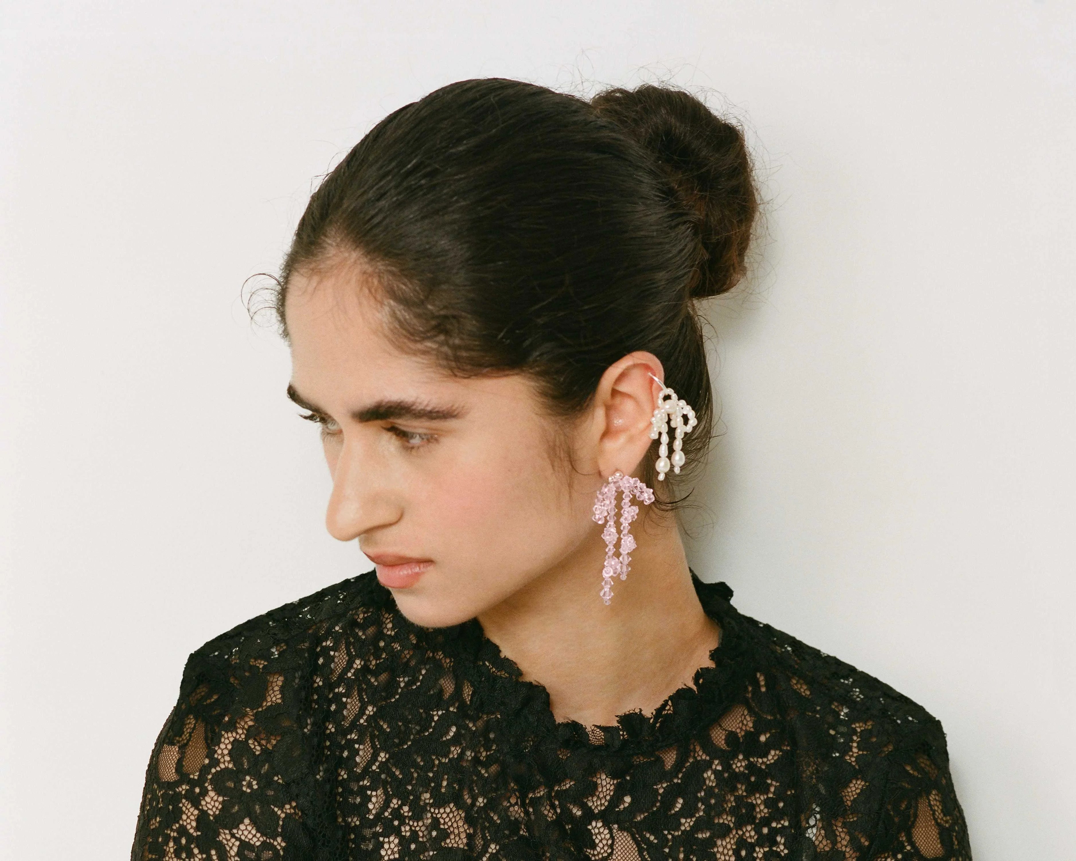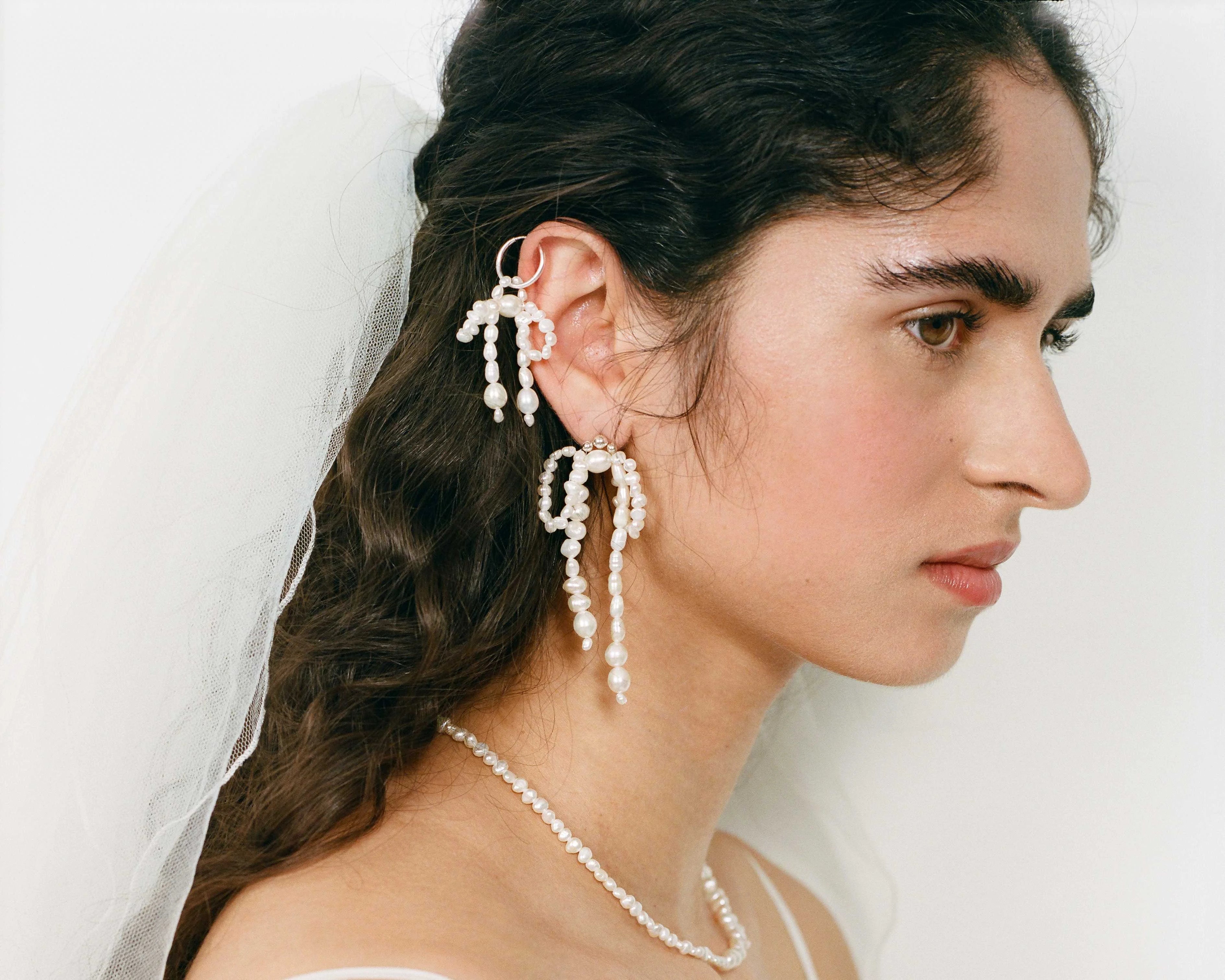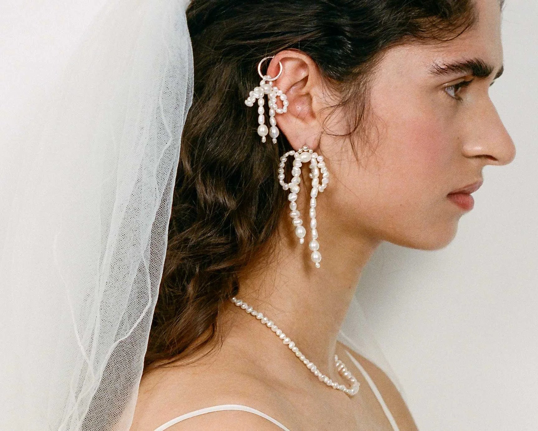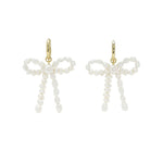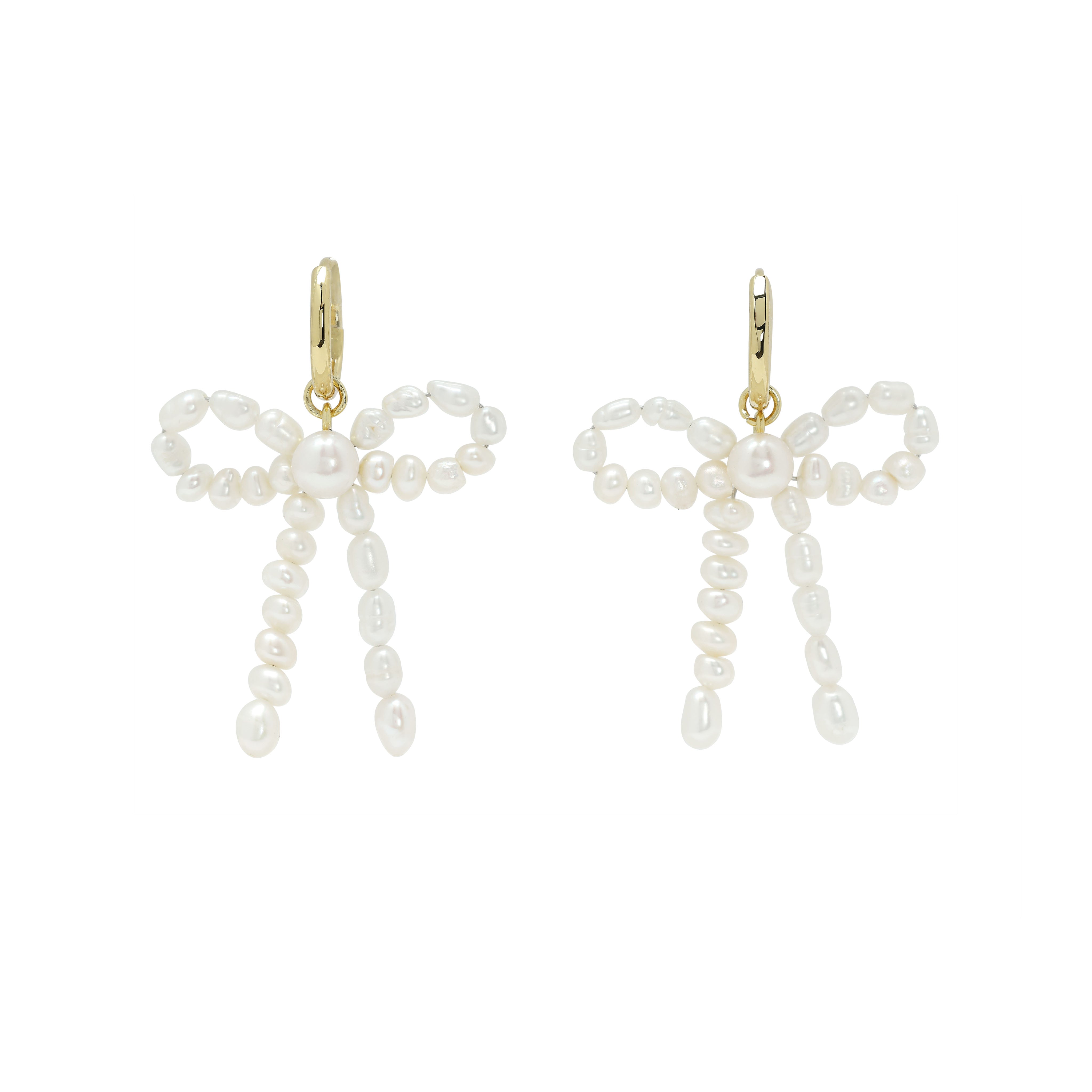 We have been designing and hand-making freshwater pearl bows since 2019; These ethereal gold hoop earrings are adorned with a removable and delicately hand-beaded bow using ivory freshwater pearls.