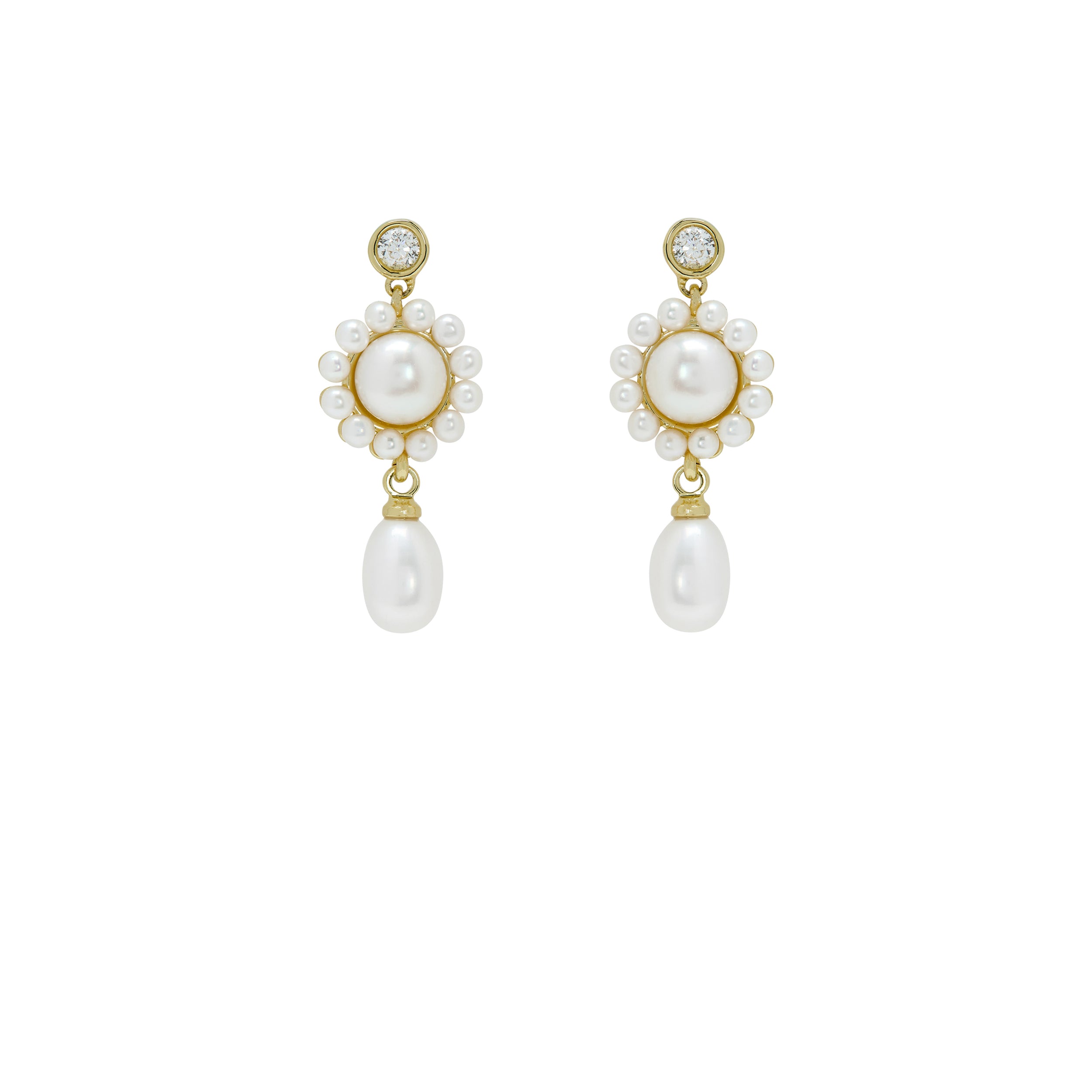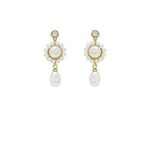 Sparkling crystal studs and lustrous freshwater pearls have been elegantly arranged into a floral shape, with a teardrop charm underneath.