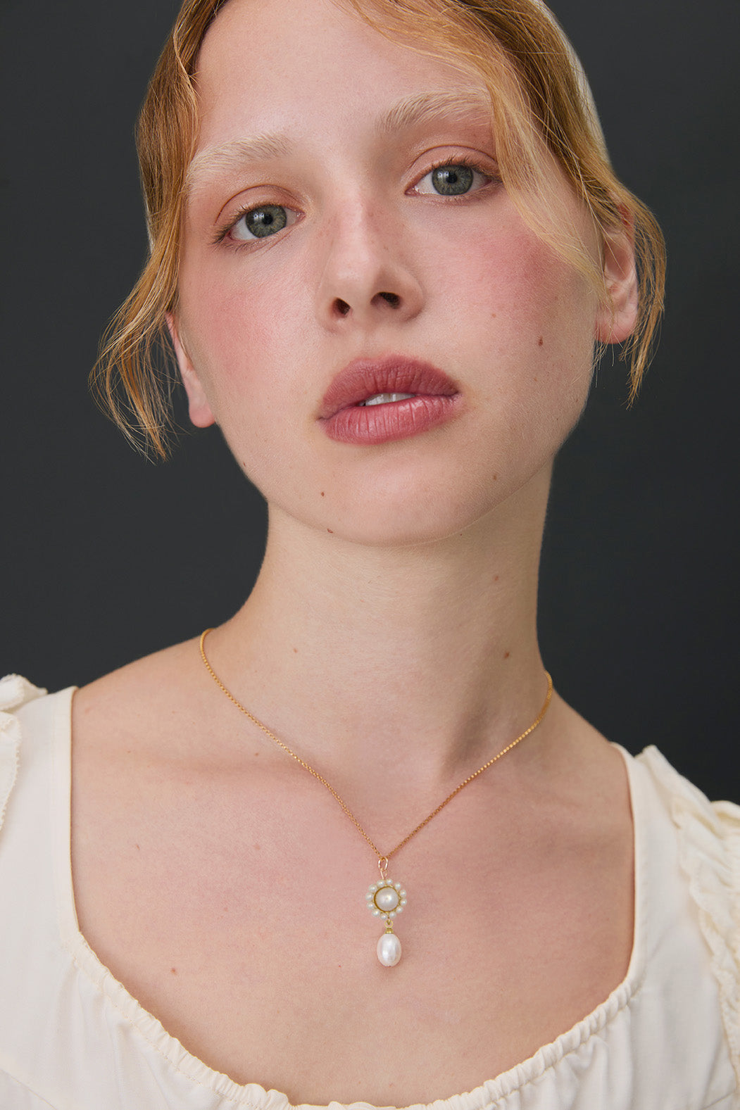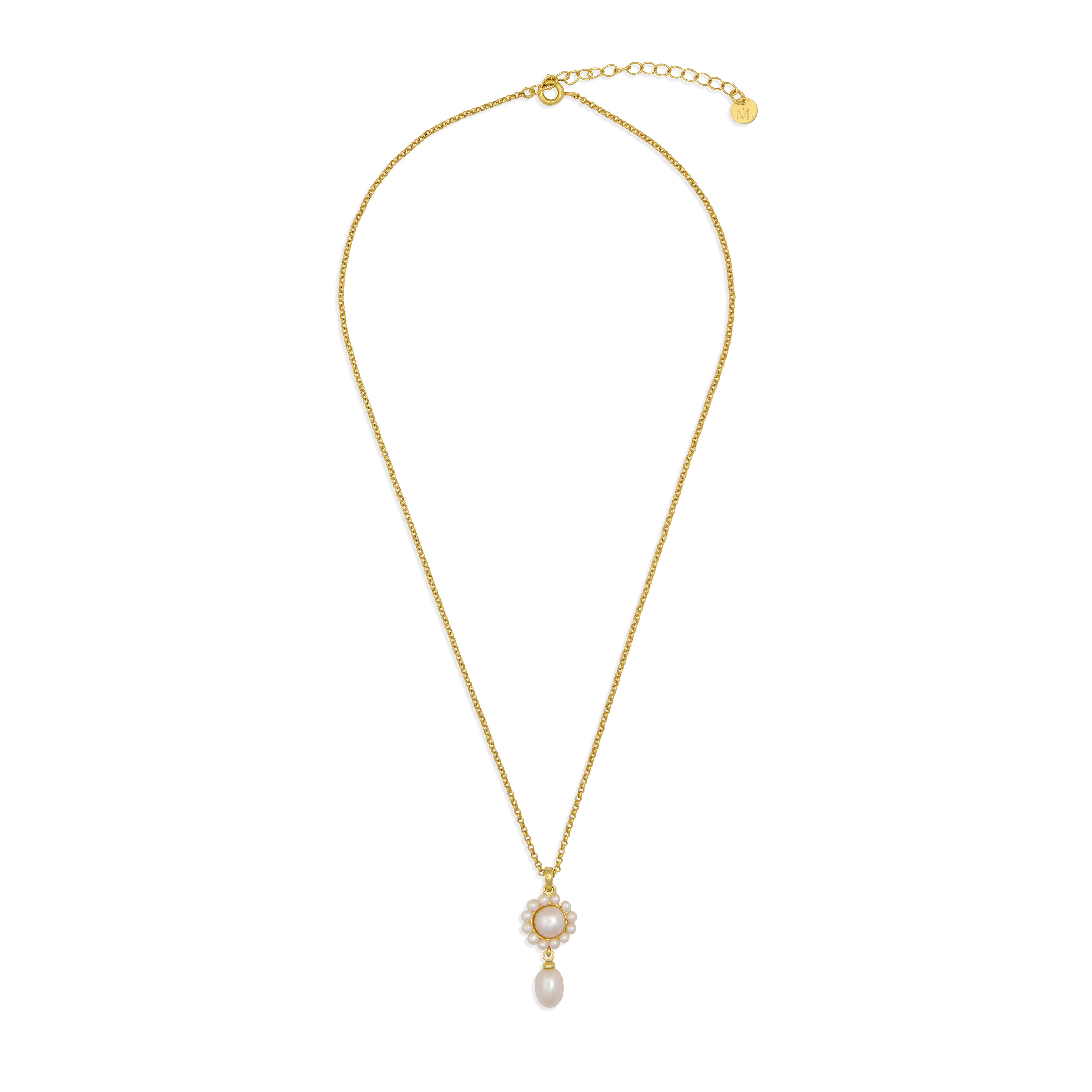 Lustrous freshwater pearls have been elegantly arranged into a floral pendant, with a teardrop charm underneath. A delicate chain necklace.