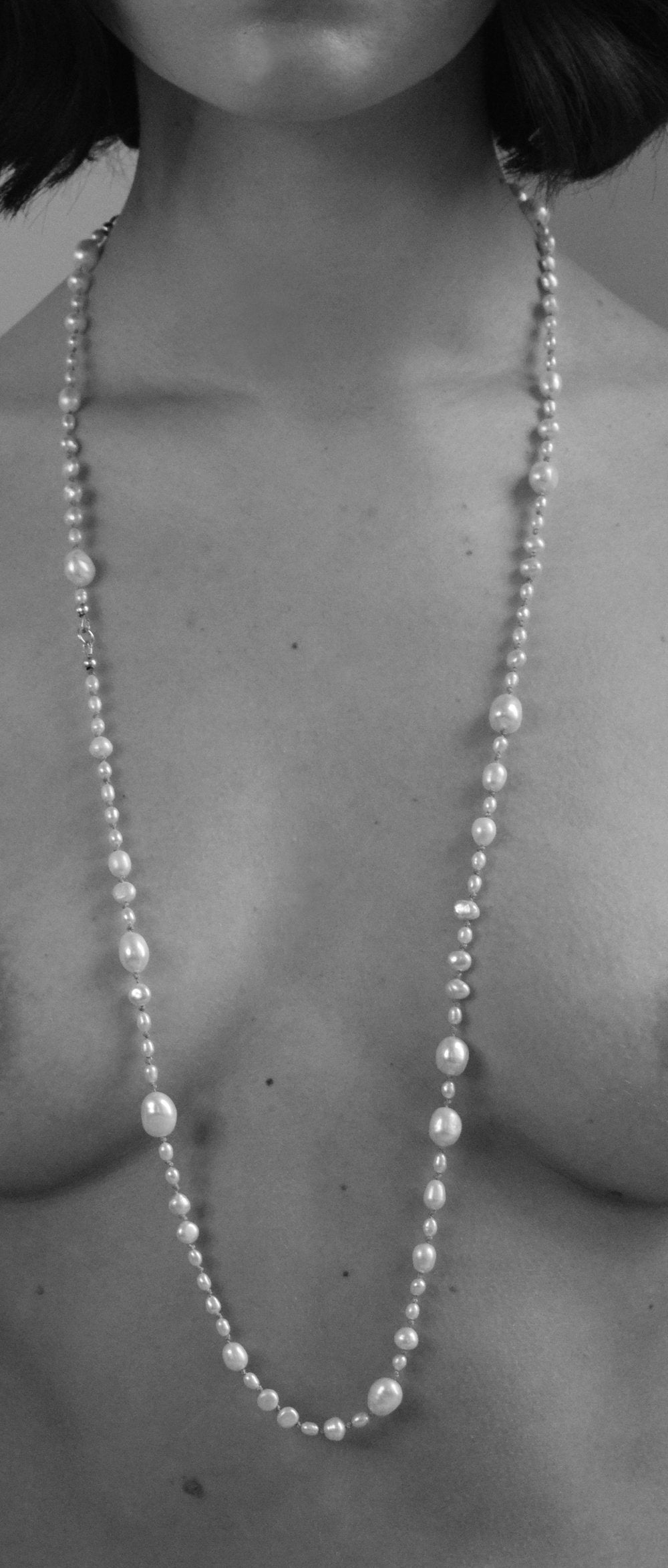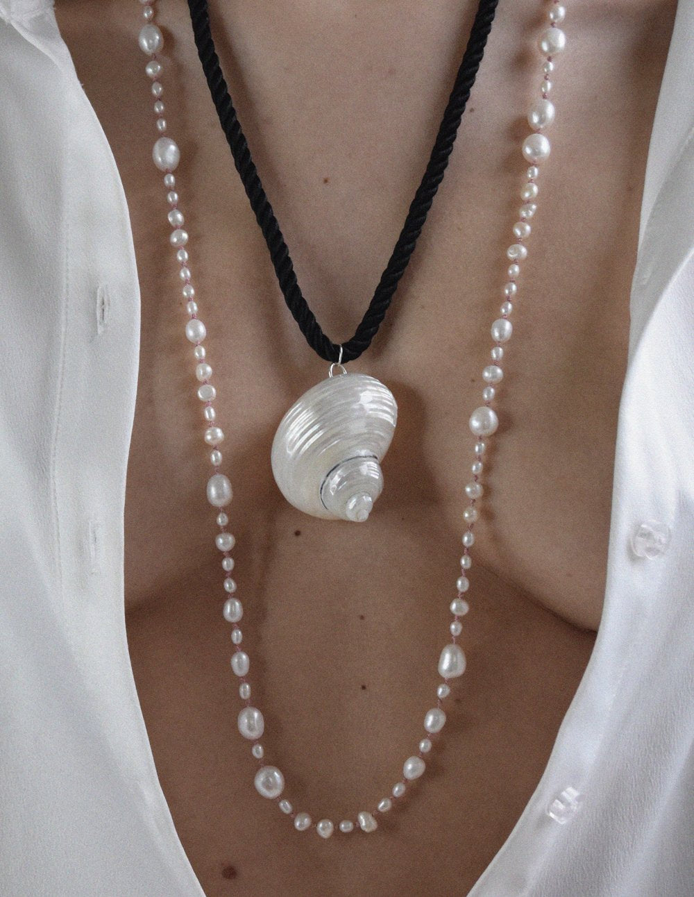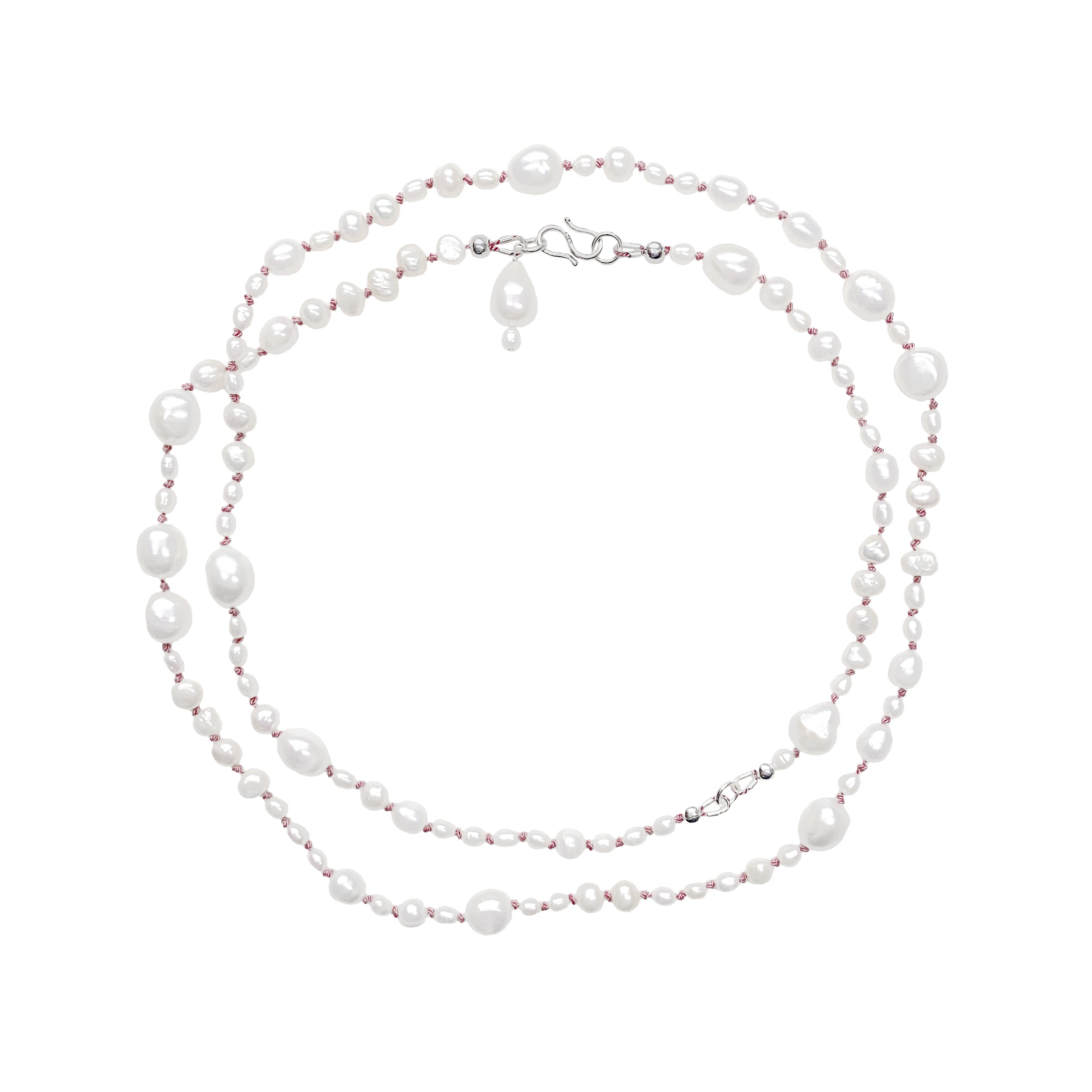 A long strand of ivory freshwater pearls intricately hand-knotted with silk thread. Can be worn doubled-up around the neck, as a belt, or long and layered with your other jewels. Please choose either pink silk or black silk.