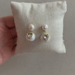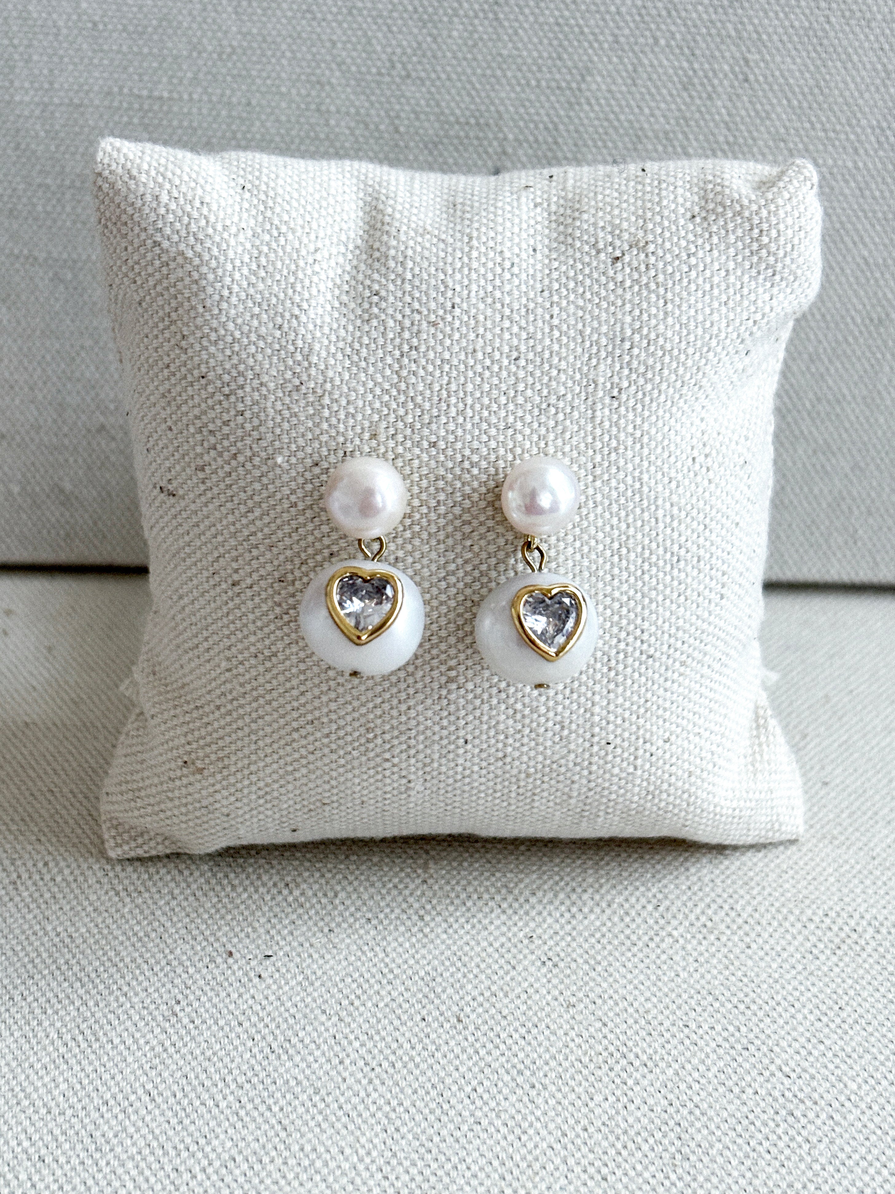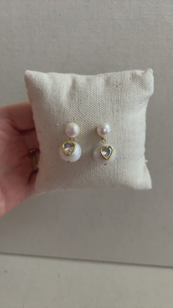 Unapologetically sparkling and romantic, these freshwater drop pearl earrings are inlaid with a bezel-set heart shaped cubic zirconia stone.