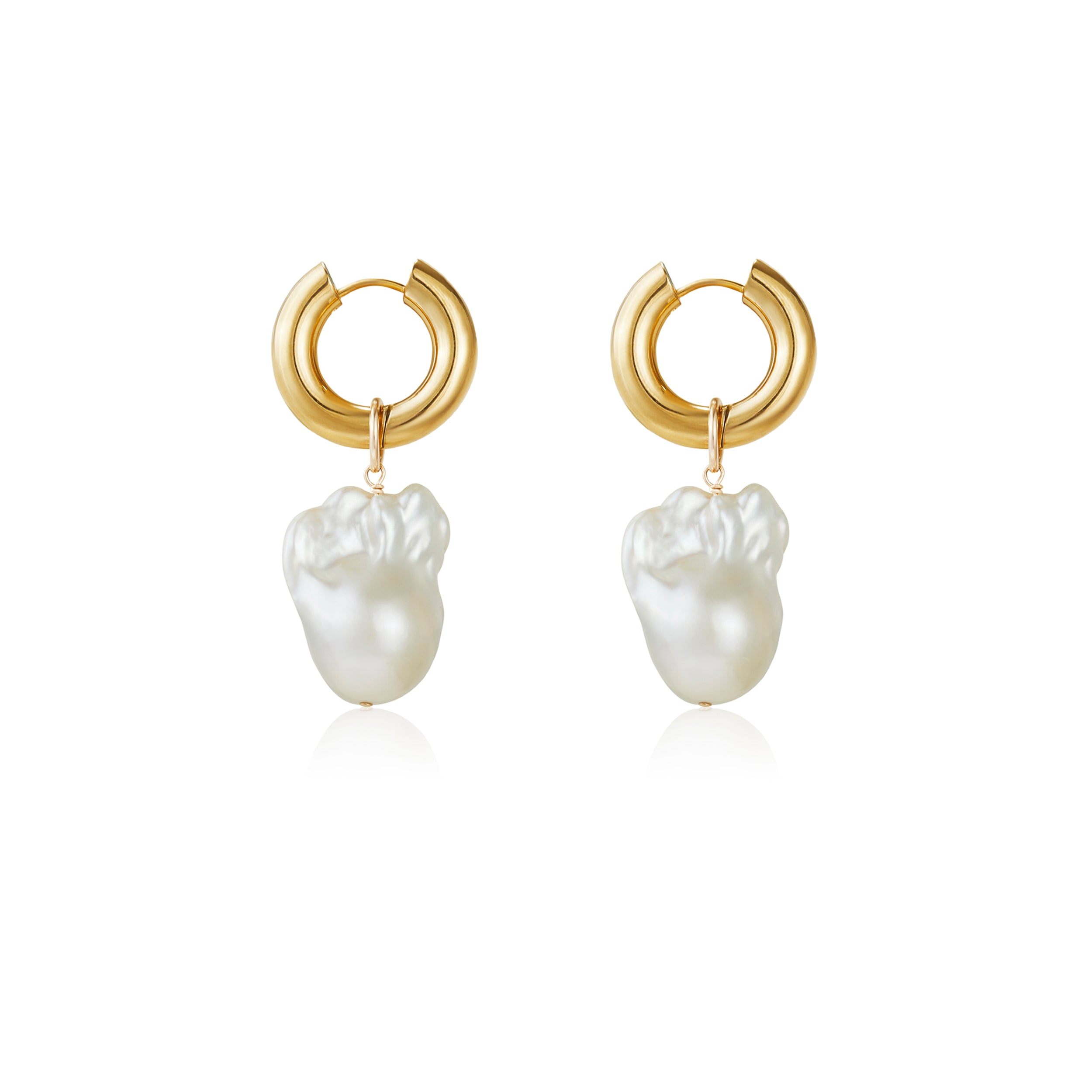 Large freshwater baroque pearls adorn chunky gold huggie hoop earrings. Chic & simple.