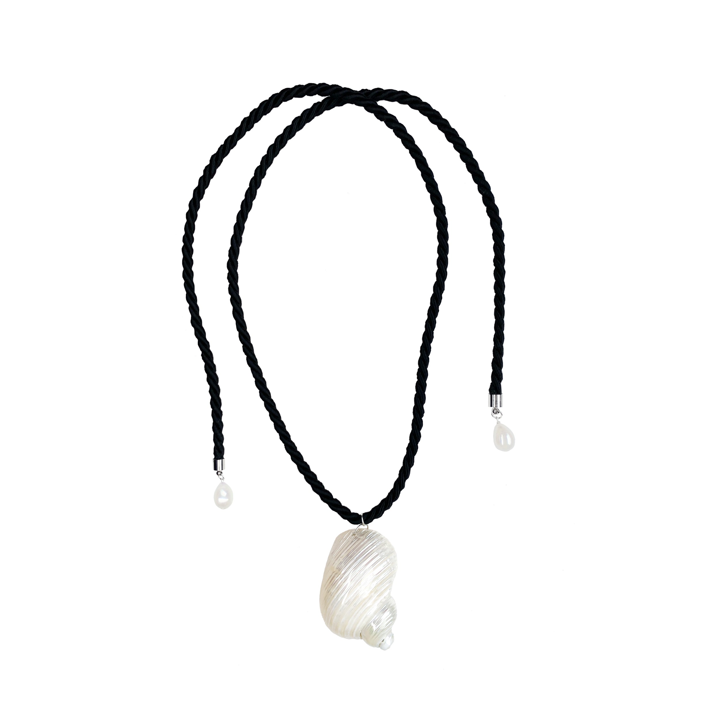 Silky twisted black cord and an ethereal shell talisman. Summon your inner mermaid.
