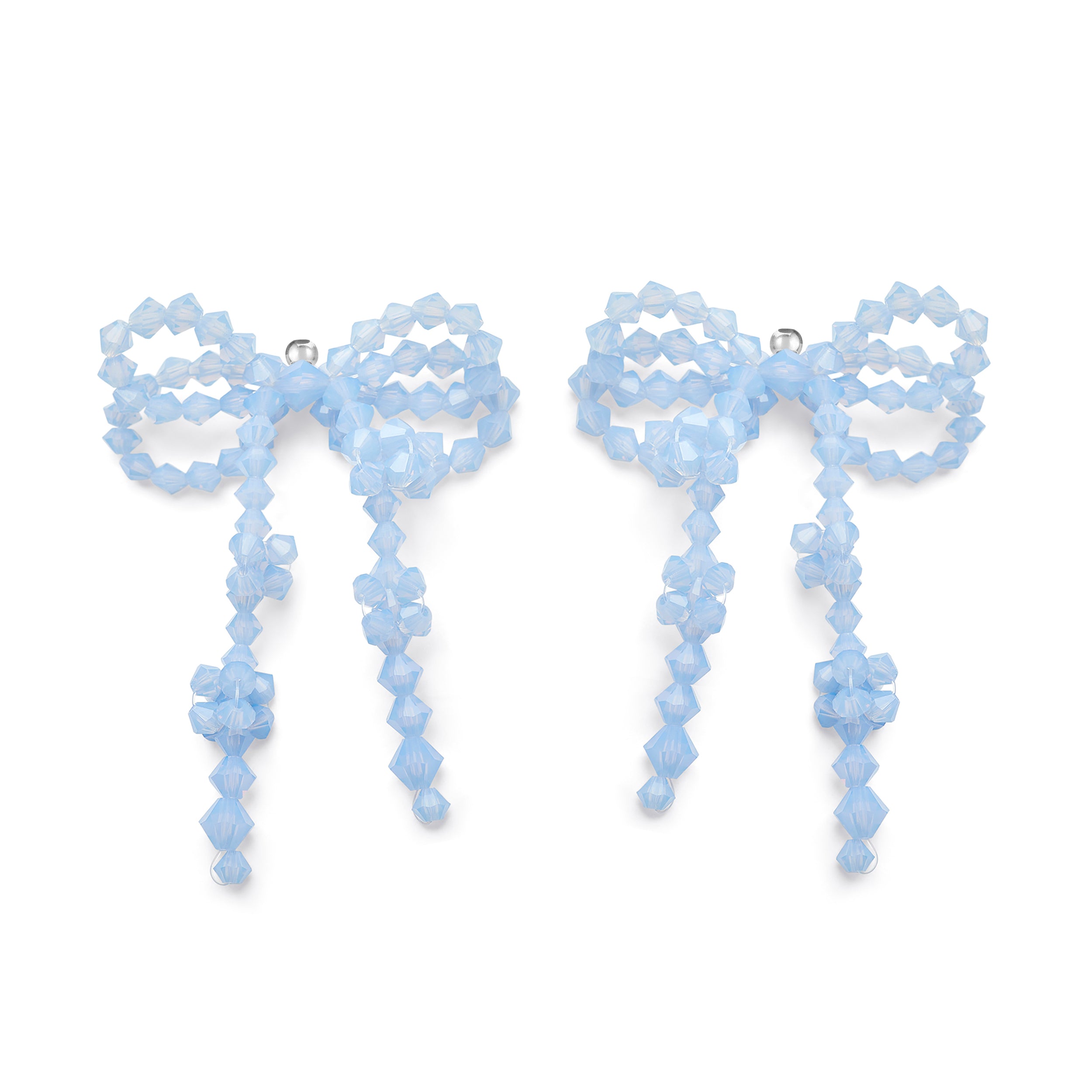 These delicate floral bows are hand-beaded using sparkling crystal in the perfect shade of cornflower blue opal, and cascade from earrings of your choice. Please select which earring finish you would like; silver studs, silver hoops or gold hoops.